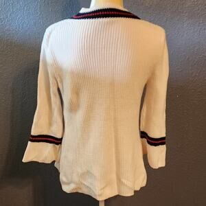 Cabi Ace Pullover Sweater White Bell Sleeve Blue Red Trim