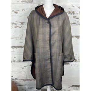 This reversible poncho features a colorful glen plaid print on one side and a micro-houndstooth print on the other.