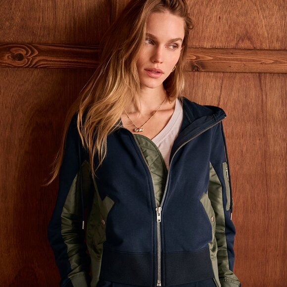 Easy fit, zip-front hoodie with a metal-tipped drawcord, front welt pockets with snaps, long sleeves with contrast nylon underneath, sweater-ribbed cuffs at the sleeves, hem, and body, inside placket, upper left sleeve pocket with a zipper