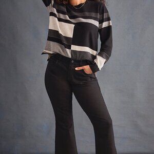 Easy fit, crew neckline, slightly dropped shoulders, long sleeves, straight high-low hem with baby side slits, asymmetrical pattern on front, stripes on back