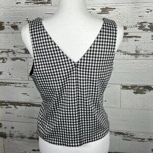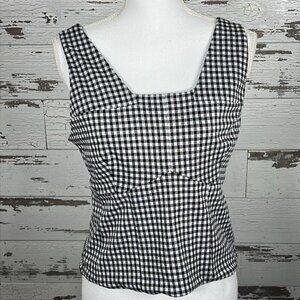 This top fits close to the body inspired by a corset inspired fit in an white and black gingham print; cropped top has quality construction including empire seaming at the bust and quality black fabric lining. Wear it with CAbi’s Bombshell Crop and a creative shoe or belt for a huge variety of styling. This is bra friendly and hits at the true waist or slightly above. Complete with a back styled detailing low cut v neckline. Approx 17" armpit to armpit, 20" shoulder seam to hem. Worn once or twice; in excellent condition.