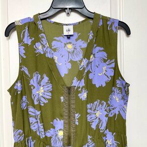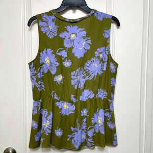 CABI Celebrity Floral Print V-Neck Sleeveless Peplum Top in Olive Green, Lavand