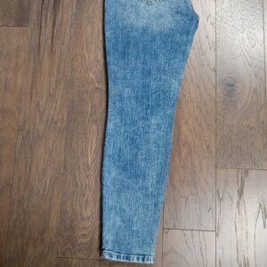 Comfortable skinny Jeans for any occasion; moderate whiskering at hips;factory distressed and faded; mid-rise; zip & double button closure; traditional five pocket design (two carpenter pockets at rear and two slash pockets with right coin pocket element on front); gold stitching; bronze tone hardware; plenty of stretch. 93% Cotton, 6% Polyester, 1% Spandex. In excellent condition. Top of waist measures approx 14" across, 9" rise, 29" inseam.