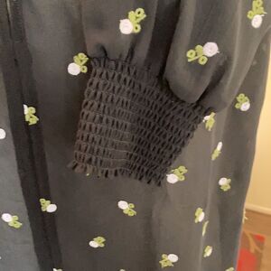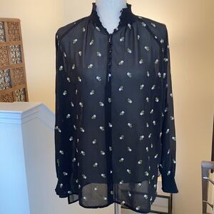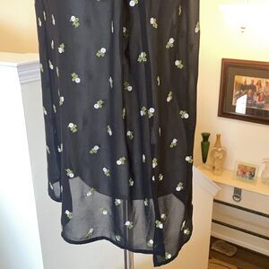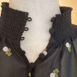Cabi Black Embroidered Blouse, Size S. Sheer top, perfect for wearing over a cami. Embroidered with tiny off-white roses and green leaves. Floaty & lightweight. Smocked neckline, cuffed sleeves and buttons with elastic loops fastening down the front; hip vents. Approx 25" armpit to armpit, 25" shoulder to hem and 25" sleeves. 100% polyester. In like new condition!