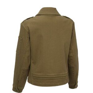Easy fit, slightly boxy, hits at the high hip, pocket details, shoulder epaulets, back horizontal zipper pocket above the hem