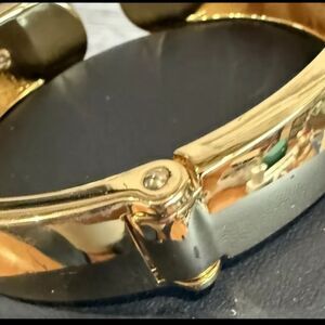 This CABI faux tortoise shell and gold cuff bracelet is a striking piece of timeless elegance. Featuring a polished gold-tone finish, the open cuff design is adorned with sophisticated faux tortoise shell accents on either end, creating a harmonious blend of vintage charm and modern flair. With an inside diameter of 2 1/4 inches, it offers a comfortable fit and easy wearability. Perfect for both casual and formal occasions, this bracelet is in excellent condition and showcases an understated luxury. Its versatile style makes it a stunning accessory for any outfit, offering a chic and effortless statement.