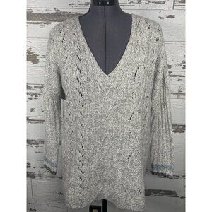 In nearly new condition. Cabi Grey Horizon Sweater XS #3848: Cozy and oversize, longer length sweater in light grey with blue & charcoal stripes at cuffs; eyelet slat design with X knit pattern; deep V neck; dolman sleeves; drop shoulders; ribbed knit on lower half of sleeves & at cuffs. Approx. 26" armpit to armpit, 27" shoulder to hem, 19" sleeves. 52% Cotton, 37% Acrylic, 6% Polyester, 1% Spandex, 4% Other. Machine wash.