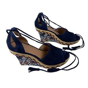 CABI Isla Wedge Navy with Southwestern Geometric Peep-toe Espadrille - Size 8