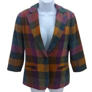 Add timeless charm to your wardrobe with this Cabi women’s wool blend happy blazer in a bold plaid pattern. Featuring a tailored silhouette with a single button closure, 3/4 sleeves, and functional front pockets, this jacket blends cozy warmth with elevated style. The vibrant multicolor palette of mustard, purple, teal, and rust makes it a standout piece for fall or winter layering. Pair it with denim for a casual weekend look or style it over tailored trousers for a polished office outfit. A versatile statement jacket for retro-inspired, workwear, or smart-casual aesthetics.