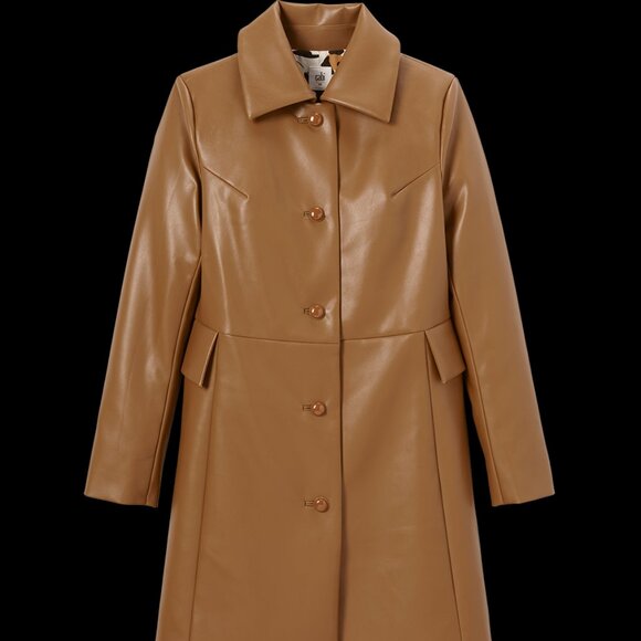 Channel your inner rockstar in the Joplin Jacket, a rebellious masterpiece that blends vintage flair with modern edge. Crafted in caramel faux leather, this knee-length coat is fully lined and includes details such as shoulder pads, flap pockets, and a waist seam to highlight your figure. This versatile item can be styled in multiple ways, to make the perfect outfit for any occasion. March to your own beat.