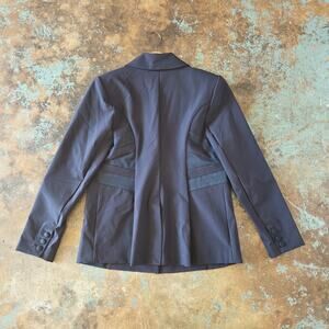 The Keynote Jacket is a classic navy blazer with sateen accents for a snatched waist. Two button closure, notched collar and shoulder pads. Slim fitting, long sleeved, unlined, welt pockets, hits at mid-hip. New with tags, no noted flaws. It measures about 20" across the bust and about 26" in length.