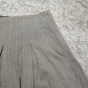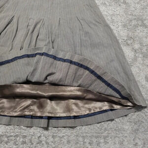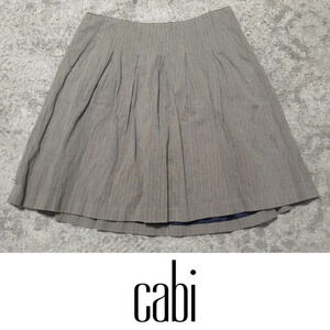 Beautiful greige taupe pleated skirt from Cabi. Subtle striped patterned fabric. Fully lined with buttery soft satin lining. Hook and eye hidden zipper closure at back. Versatile. Fits many style aesthetics from equestrian to academic / Preppy.
