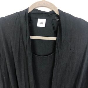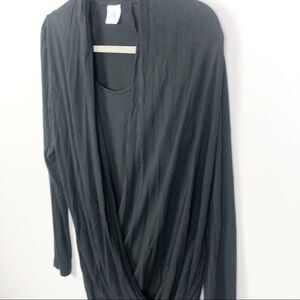 Cute black wrap front top from CAbi called the Fickle Tee. Layered tank and attached long sleeve wrap top. Looks great dressed up or down! Tiny hole in the outer layer as shown in the last photo but with the tank underneath it doesn’t show through to skin. Otherwise great condition! Size Small.