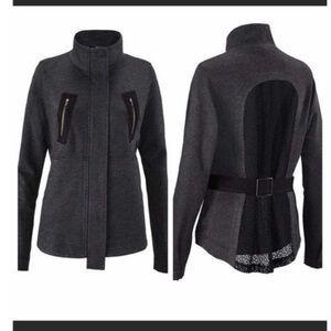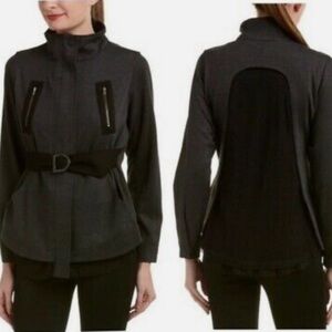 Charcoal gray and black jersey knit and mesh sporty utility style jacket. Soft and comfy, but stylish too! Full zipper front, high collar, waist pockets, faux zip chest pockets. Collar can be worn down when unzipped or up when fully zipped. Cinch belt can be worn in front or back. T-shirt like material lining on inside and peeks out the bottom hem. Mesh back panel. Snap cuffs.