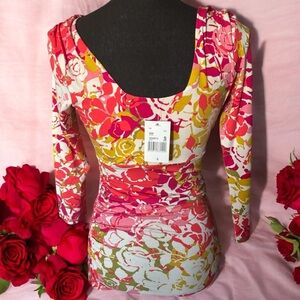 Brighten your wardrobe with this vibrant floral top. Featuring a mix of red, pink, yellow, and green hues, it's perfect for any occasion. Plunge, scoop neck, empire waist, 3/4 length sleeve, ruched waist , very stretchy form fitting, rayon/ spandex blend. Measurements 16” pit to pit, 26” length. New with tags!