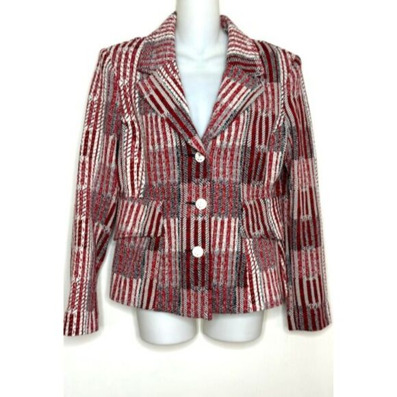 Unique nautical, patriotic, textured red white & blue patchwork blazer featuring princess seaming, notched lapel, white & gold anchor buttons, 3 button closure, 3 matching (working) buttons on the cuffs, flap pockets that wrap and create a slight peplum back, flap pockets, lightly padded shoulders for structure, back vent (still tacked closed) style #6028. Made of machine washable 64% cotton, 34% polyester and 2% spandex. Measurements: Bust: 38" Length: 23" (center back tag to hem)