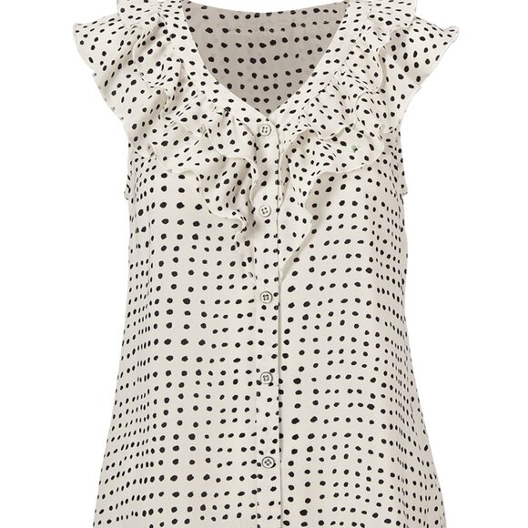 Add a playful twist to your wardrobe with the Polka Dot Top, a black-and-white ruffled blouse with a button-front design. The ruffles along the V-neckline create a cap-sleeve effect to elevate your everyday style. Connect the dots and make a fashion statement!