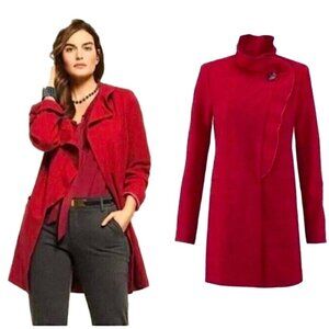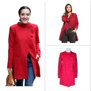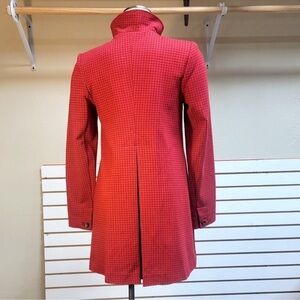 CABI Red Houndstooth Celebration Ruffle Detail Long Coat Size XS
