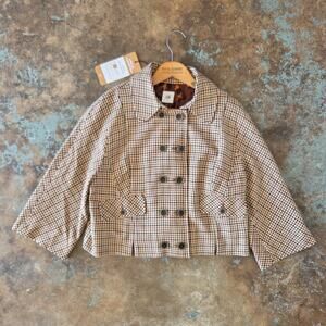 The Showroom Jacket is a classic short blazer in a brown, black, olive and tan houndstooth pattern. Front double breasted button closure, spread collar. Boxy fitting, 3/4 sleeved, fully lined, hits just above the hip. New with tags, no noted flaws. It measures about 23" across the bust and about 19" in length. Size large.