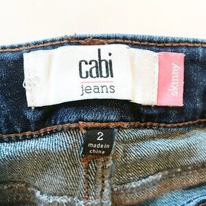 Cabi Skinny dark wash low rise stretch jeans. Button & zip fly, 5 pocket, size 2, cotton polyester spandex blend, fading on knee-see photos. All measurements in photos. Smoke and pet free home.