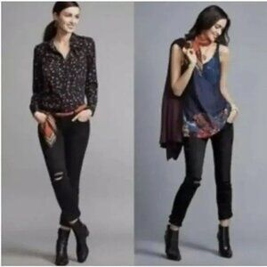 Factory distressed and aged; CABI slim boyfriend jeans in washed black. Worn just a few times; in excellent condition. Classic 5 pocket style; tapered legs, zip/button closure; Cotton/Spandex; Machine wash. Top of waist approx 14" across, 8" rise, 31" inseam.