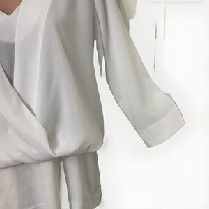 Elevate your office attire with the CABI White Indulge Peplum Waist Overlay Blouse. Designed with a flattering V-neck and 3/4 straight sleeves, this top is a versatile addition to your wardrobe, suitable for various occasions from business meetings to weddings. The crisp white color exudes a classic, timeless elegance, while the subtle peplum waist and pleats add a touch of sophistication.