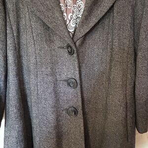 This CAbi women's coat is a gray wool blend tweed swing style with a mid-length, featuring a hi-low hem and button closure. It is lined with polyester and suitable for casual, workwear, or business occasions. The coat has a retro, Parisian, preppy theme and is ideal for winter, fall, and spring seasons.
