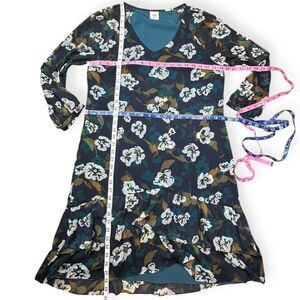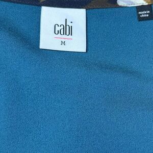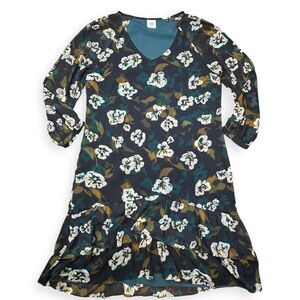 This stunning Cabi “Pirouette” dress features a navy, green, and white floral print with tiered ruffle hem and sheer chiffon overlay. A flattering V-neckline and 3/4 sleeves give it an elegant yet wearable look, perfect for dressing up or down.