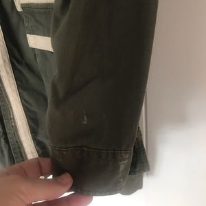 Cabi jacket loose fitting. Arm has slight discoloration near wrist. ( see picture). Olive green distressed.