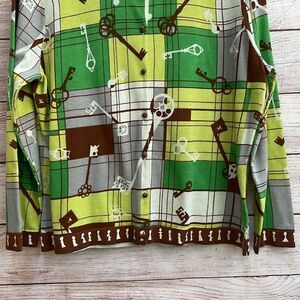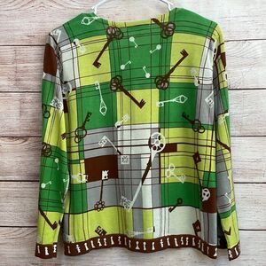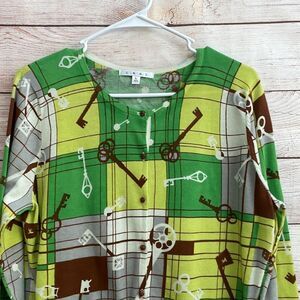 EXCELLENT CONDITION CABI CARDIGAN SWEATER IN KEY PRINT SIZE LARGE BUTTON FRONT PIT TO PIT 20 INCHES SHOULDER TO HEM 22.5 INCHES 100% COTTON