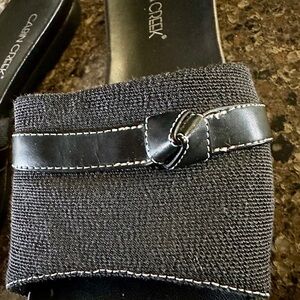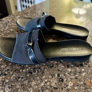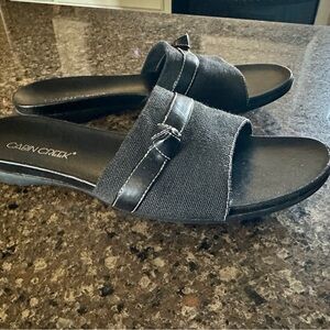CABIN CREEK, WOMENS, BLACK SLIDE SANDALS. BLACK FABRIC WITH A LEATHER BAND. 7/8” HEEL. SIZE 8 1/2M