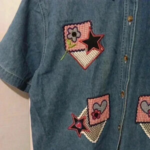 The shirt also has appliques and buttons as accents, adding a touch of elegance to the overall design. It is machine washable and perfect for any casual occasion. Available in size L, this button-down shirt is a must-have for any fashion-conscious woman.