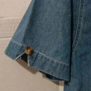 This women's button-down shirt by Cabin Creek is a stylish addition to your wardrobe. Featuring a solid denim blue color with red, white, and blue trim, this shirt has a collared neckline and short sleeves. It is made of 100% cotton and has a regular fit, making it comfortable and easy to wear.