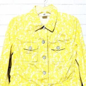 Pretty and lightweight field jacket in a bright yellow and white floral design. Button front. Four front pockets.