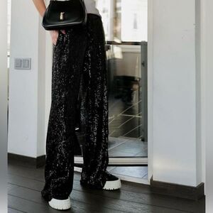High waisted sequin pants. Fully lined, high rise, side pockets, elastic waist, wide leg.