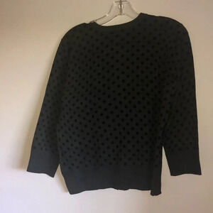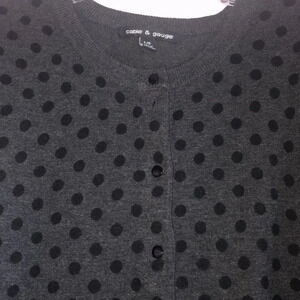Cable and gauge button down sweater. It is a gray sweater with cute black polka dots all over it.