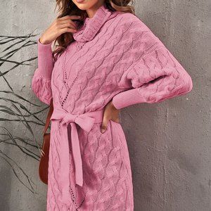 CABLE-KNIT BELTED TURTLENECK SWEATER DRESS