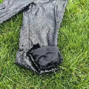 Cable&GAUGE 2 PCs Set. Short Sleeve top and Pants. Sequin Black. Pull on pants, lined, tapered. Comfy. Shirt has beautiful puff shirt sleeve detail, lined, keyhole with button.