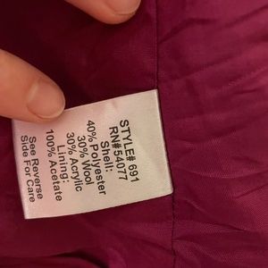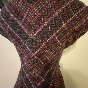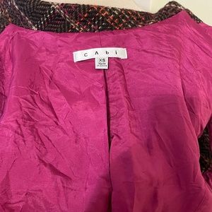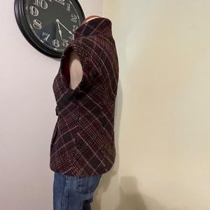 Like New CABi brand sleeveless jacket or vest- fully lined in soft fuschia polyester so it slips on. Great dark brown wool blend houndstooth weave with streaks of bright orange, light beige, and more fuschia. Really subtle but statement making. Has great princess seams to enhance your silhouette and a tie front to cinch your waist. Great for the transition to fall or as a layer in winter. In like new condition, no flaws to note.