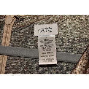 This CACHE Gold Gray Shimmer Animal Print Cowl Neck Sheath Dress is a stunning choice for making a stylish statement. The dress features a metallic gold and gray animal print that adds a touch of glamor to its sleek silhouette. With a flattering cowl neckline and a fitted sheath style, it hugs the body beautifully, creating an elegant draped effect. The long sleeves are finished with zipper details, adding a modern twist to this sophisticated piece. Perfect for special occasions, this dress is designed to stand out. Size: Small. Zipper sleeve cuffs; zipper side slit with ruching; Concealed back zip closure
