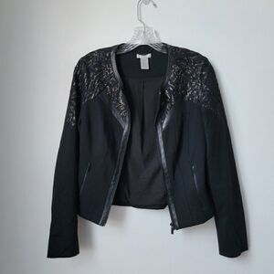 CACHE Black Gold Faux Leather Trim Jacket Blazer Size 2 Embroidered Lace