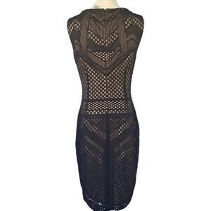Make a sophisticated statement! This form-fitting black lace sheath dress features a unique geometric pattern over a nude lining. A perfect choice for cocktail parties or a chic night out.