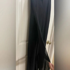 This is a listing for a pair of preowned CACHE Cocktail/Party High Multi-Split Leg Chiffon Overlay Black Pants Size 14. The closure on front of waistband is missing the attaching piece, would be easy to replace. Otherwise pants are in great condition. High split on each side of chiffon, satin lining pants. Please see all photos for details as they are part of the description.