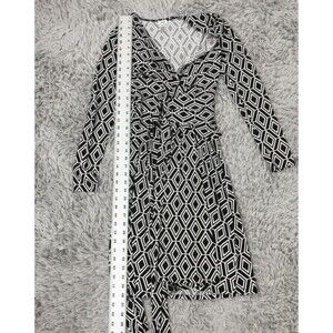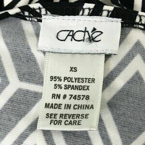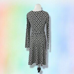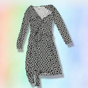 CACHE Faux Wrap Stretch Knit Dress XS Black White Print Long Sleeve