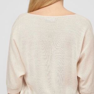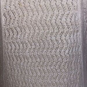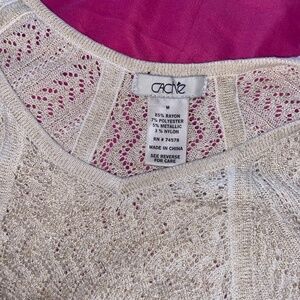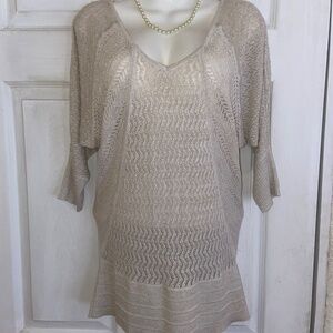 Cache, sweater size M Beige color with golden threads 53 cm from armpit to armpit 69 cm long Knitted sweater, Rayon, polyester, nylon, metallic.