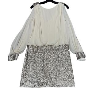 Stunning Cache cocktail dress featuring a soft cream blouson top with cold shoulder detail and a fully sequined silver skirt. The long sleeves are sheer with matching sequin cuffs and shoulder accents. Feminine and flattering, this is the perfect dress for a holiday party, NYE, or any special occasion.