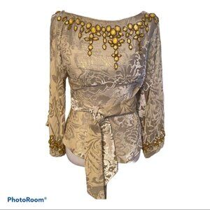 Cache woman’s blouse top semi sheer cream gold metallic burn out style belt sash heavily beaded boat neck wide sleeves size S