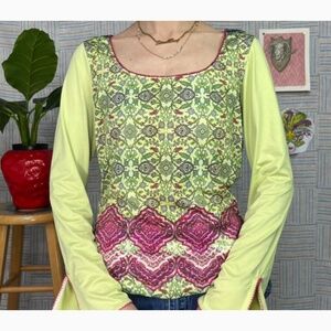Cache blouse long sleeve number 3 bicolor 63 cm long sleeve 52 cms from armpit to armpit 60 cm long hippie style blue color on the back with mandala. Delicate rhinestone neckline, polyester and elastane