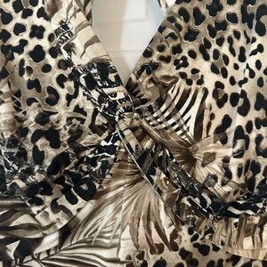CACHE TROPICAL-ANIMAL PRINT SLEEVELESS SHIRT. Gorgeous design twisted under the breasts. EXCELLENT CONDITION! I have worn this exactly 2 times and have outgrown it, so figured it was time to share with someone who would wear her and show her some ❤️love. I have many sleeveless to post, so stay tuned 😄.