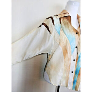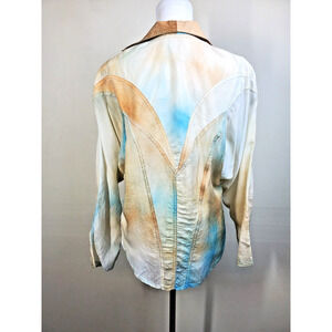 CACHE Vintage 80's Womens Top Collared Leather Accents Snap Front Rayon Unique Details Made in the USA Multi-Color Lightweight 1980s